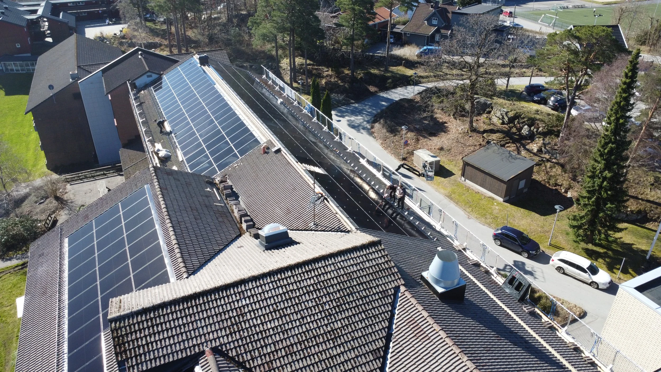 Fugleperspektiv på solcelleinstallasjon for Enøktotal på kommunal omsorgsbolig i Kristiansand. Bildene her gir en god oversikt over takflater og arbeidsområder.
